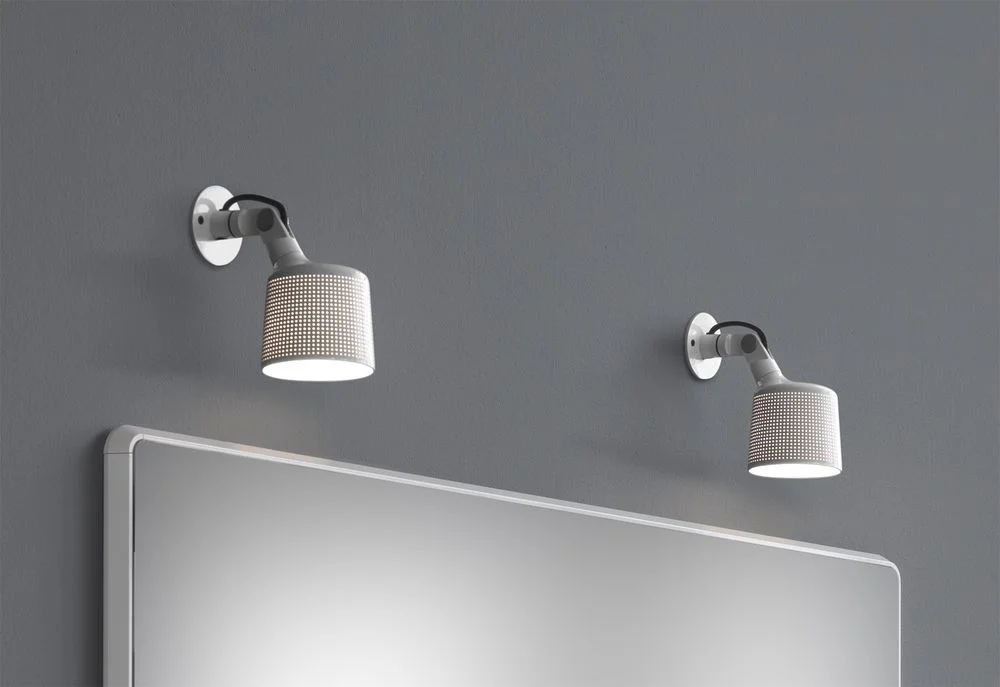 Each lamp features a matte glass diffuser and a shade perforated with tiny dots that allow light to emit from all sides, giving off a nice, calming glow. Its simple shape and monochromatic scheme (except for hardware details, which are done in stainless steel) make it easy to place a light anywhere in a minimalist home without drawing too much attention to itself.