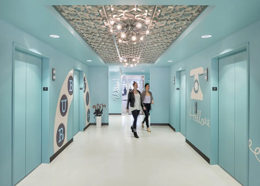 As staff and visitors approach the Ruby Receptionists headquarters in Portland, Oregon, the first thing he or she notices is pronounced curvature on the north side of the facade. The curved building, which stands out in a sea of super-white, uniform buildings, beckons visitors and employees and foreshadows the playful-yet-sophisticated interior space designed by IA. Culling from curvaceous exterior design cues, the IA design team incorporated a variety of angles and curves that reflect Ruby’s brand position throughout the interior workplace.