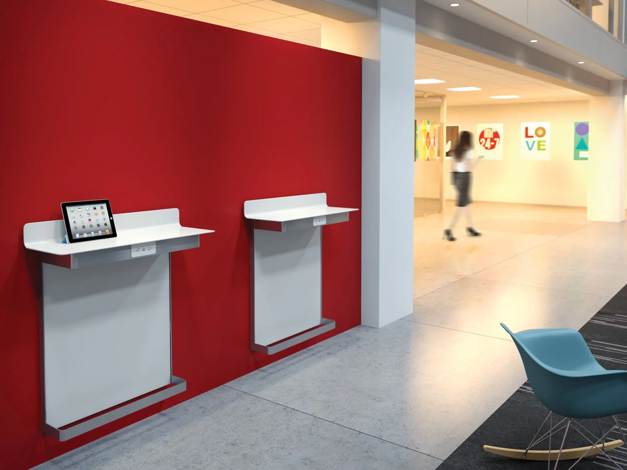 GoTo Wall-Mounted worktables use minimal space for maximum utility. Ideal for short term mobile multi-taskers or a connection space for focused tasks.