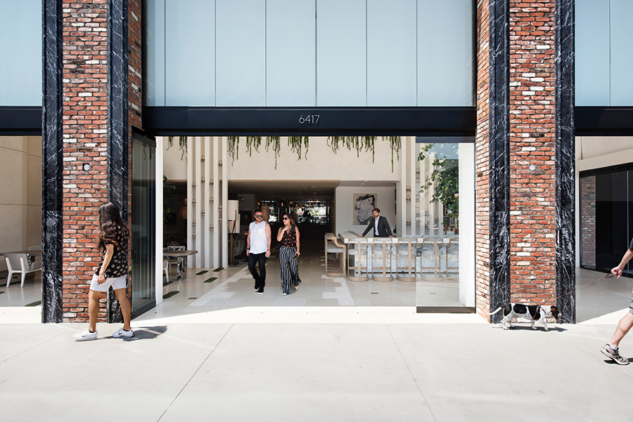 Some of these venues opened earlier iterations in New York, and have now been translated for an L.A. sensibility. Whereas the New York versions span the Lower East Side to the Meatpacking District to Midtown, linked by subway lines and taxicabs, they’ve been condensed in L.A. into a single-destination complex centered on a slate alleyway wedged between brick buildings, an homage to New York City’s pedestrian-oriented experience. “The public esplanade allows us to accommodate multiple drop-offs and walk-ups, and not congest the streets,” says Sullivan.