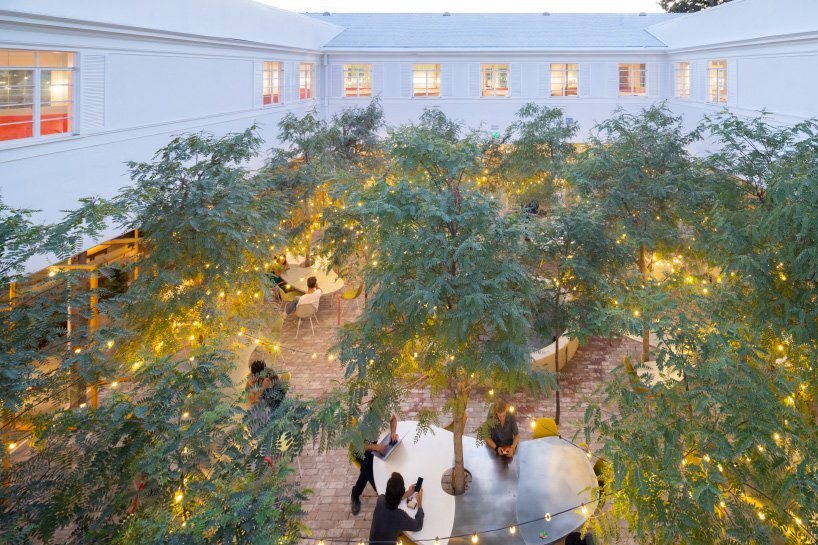 The area that was once a place to park cars has been filled in with 60 yellow-roofed acrylic pods, each a private, contained work area, as well as over 6,000 verdant tropical plants that give the space the look of a futuristic botanical garden.