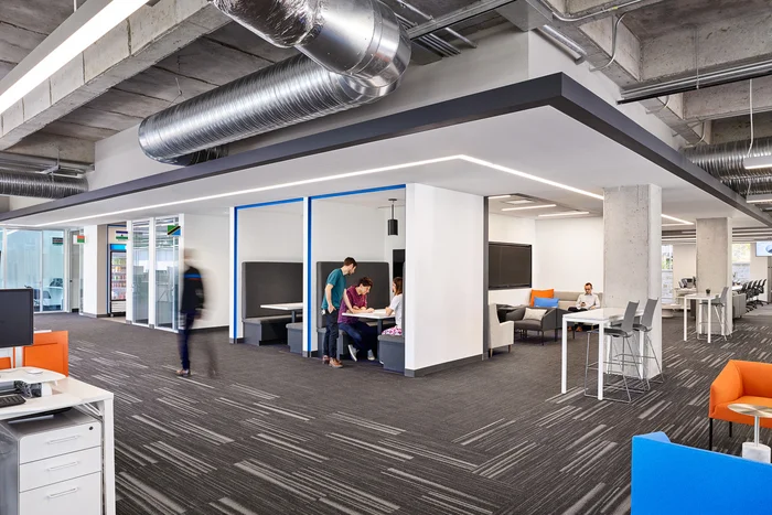 The lobby has a two-story video wall displaying custom graphics inspired by the office’s current events. Spread across seven floors in two buildings, the open office offers employees a full-service cafe, a barista and juice bar, beers on tap, and a fitness center with a yoga studio.